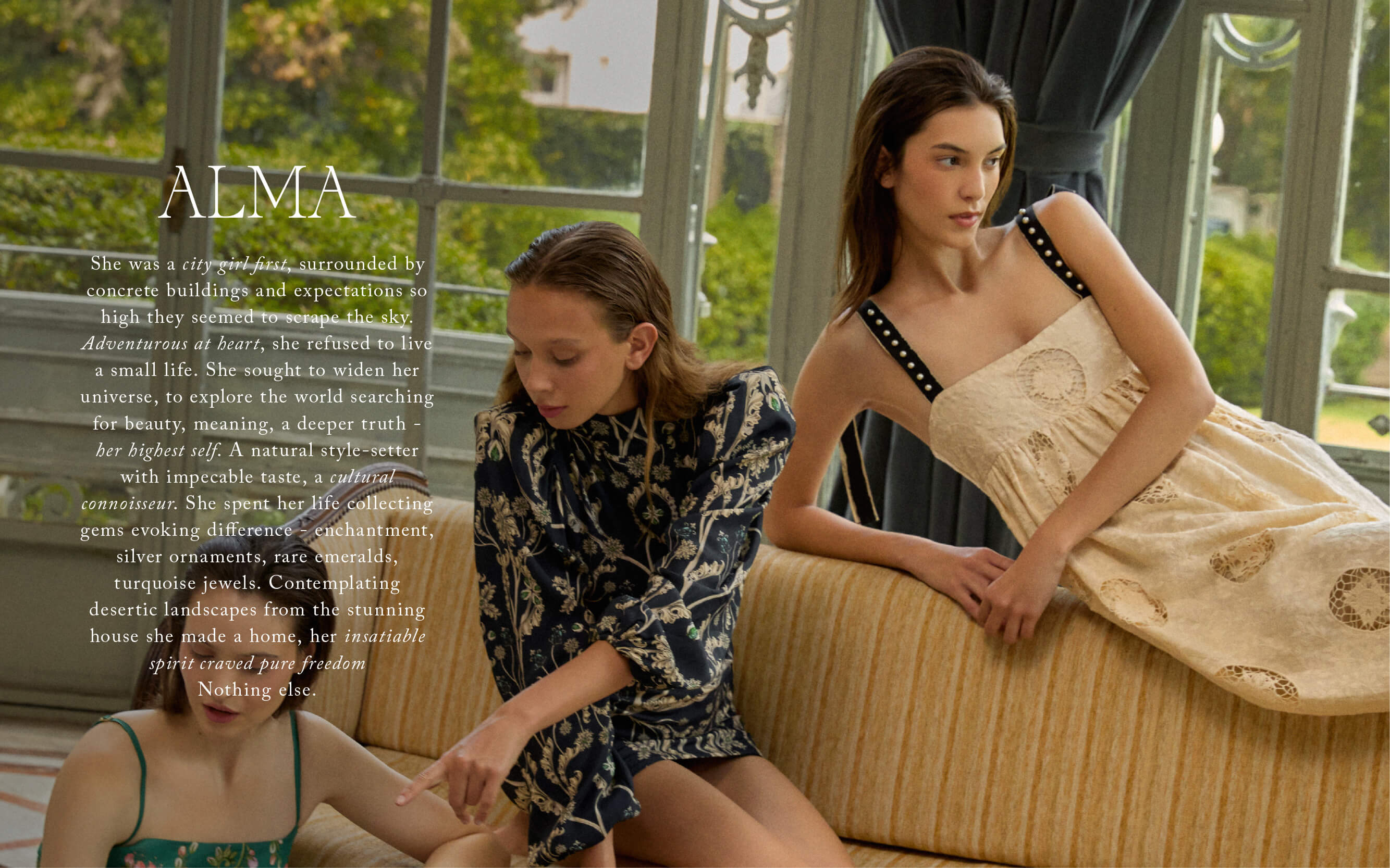 She was a city girl first, surrounded by concrete buildings and expectations so high they seemed to scrape the sky. Adventurous at heart, she refused to live a small life. She sought to widen her universe, to explore the world searching for beauty, meaning, a deeper truth - her highest self. A natural style-setter with impecable taste, a cultural connoisseur. She spent her life collecting gems evoking difference - enchantment, silver ornaments, rare emeralds, turquoise jewels. Contemplating desertic landscapes from the stunning house she made a home, her insatiable spirit craved pure freedom Nothing else.