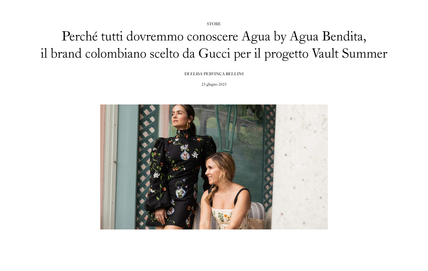 Agua by Agua Bendita è uno dei brand protagonisti del progetto Vault Summer di Gucci e siamo pronti a scommettere che nei prossimi mesi cocktail ed eventi - compresi i matrimoni - “fioriranno” dei loro abiti romantici e ricoperti di ricami e stampe botaniche. Ecco perché è un’ottima notizia. In una location da sogno - la Foleia, a un’ora da Milano - abbiamo incontrato due amiche colombiane che nei loro brand - Agua Bendita e Agua by Agua Bendita - si impegnano a valorizzare l’artigianato del loro Paese, la Colombia e proprio per questo sono state scelte da Gucci per il progetto Vault..