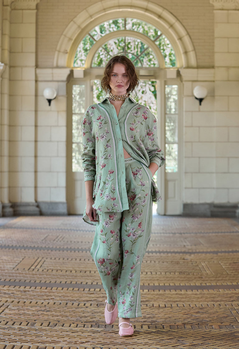 Our ´Cecilia Honeysuckle´ button-down shirt is as chic as it is versatile with it’s delicate floral print. Create a flawless look by wearing it with our matching ´Florecer Honeysuckle´ linen trousers.
