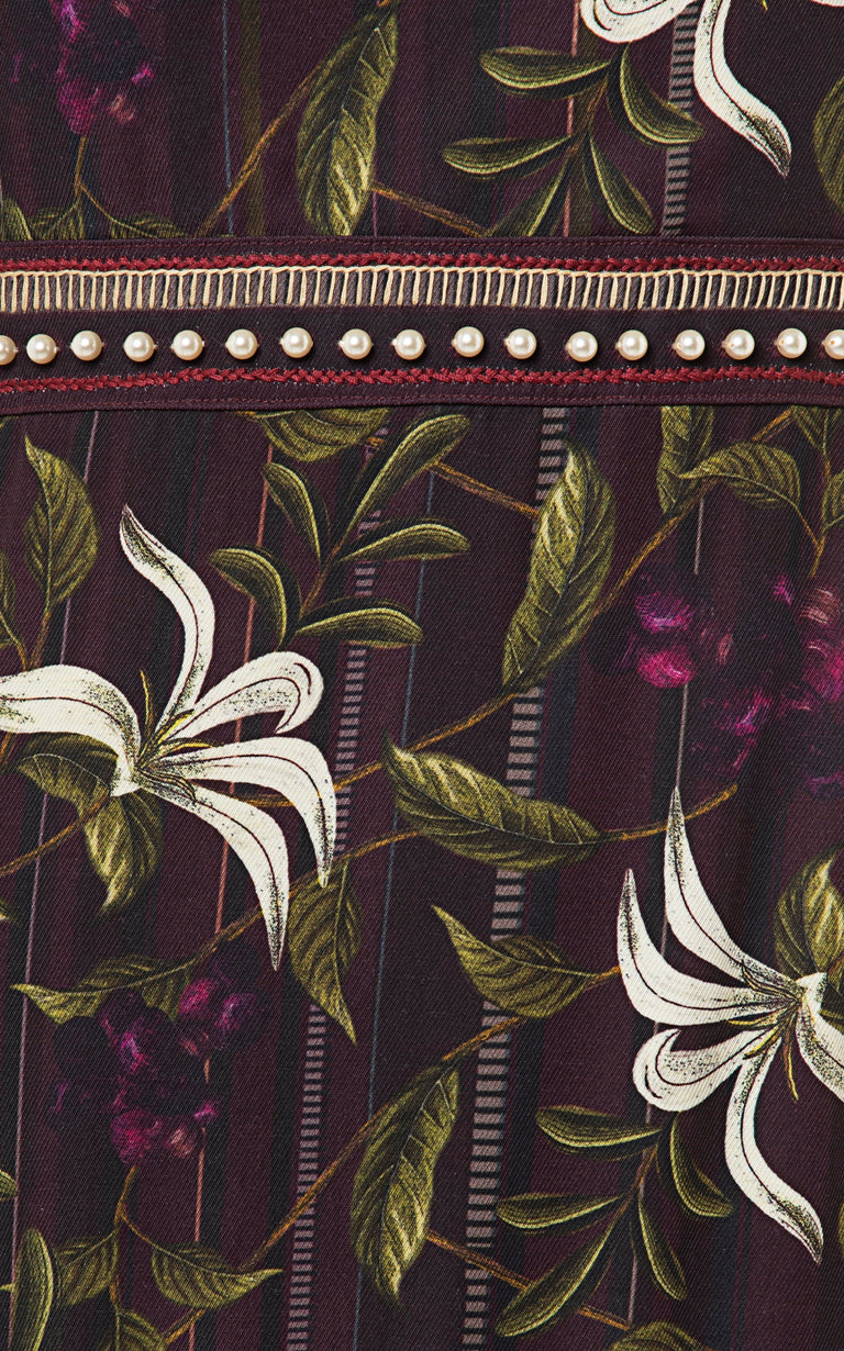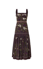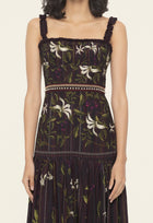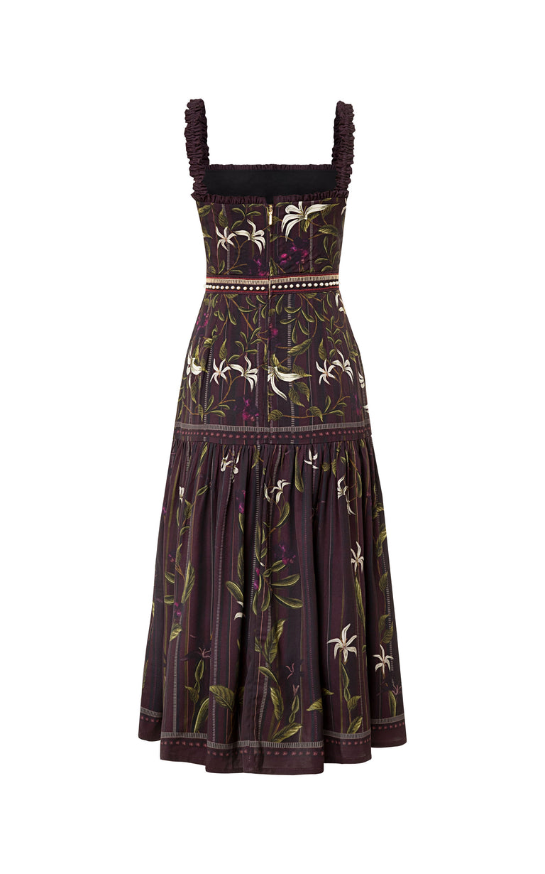 Easy and fun, the Níspero Café midi dress features ruffled details lining a square neck, decorative buttons in the front, and concealed zip fastening along the back. With some delicate pearls surrounding the waist, this piece becomes a season favorite.