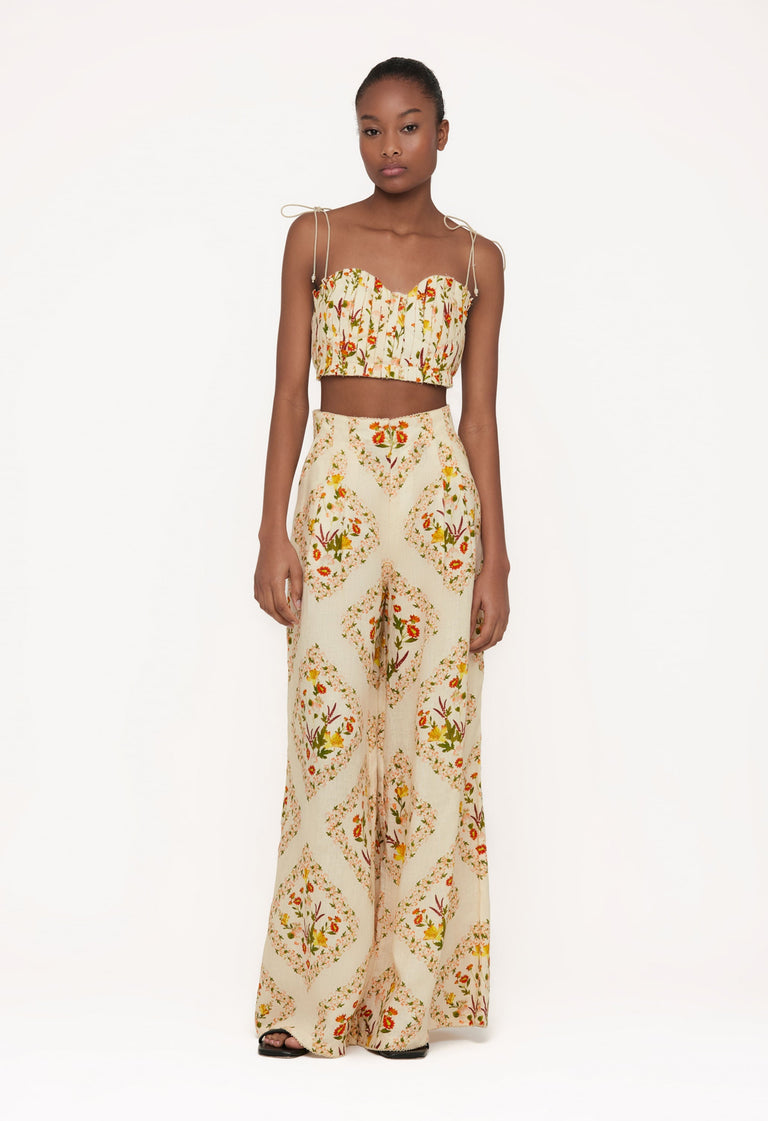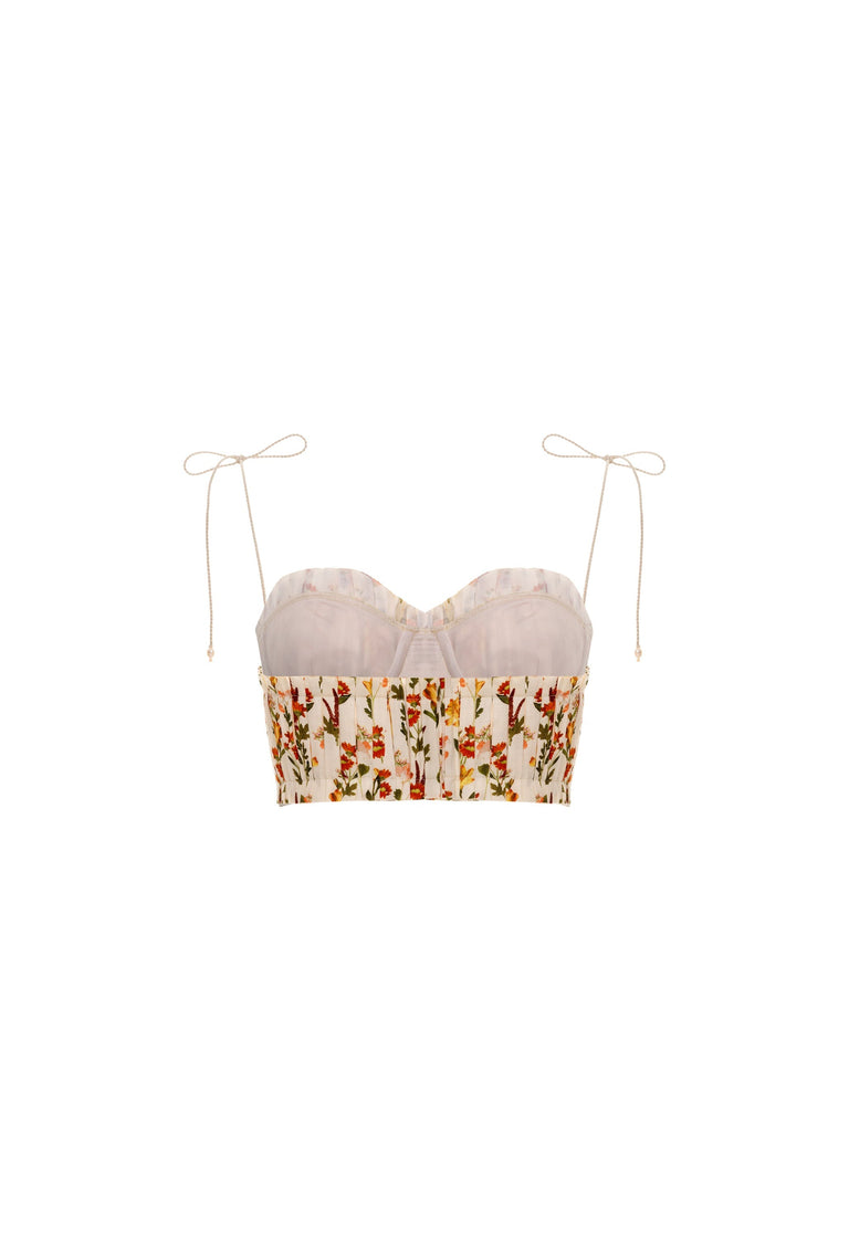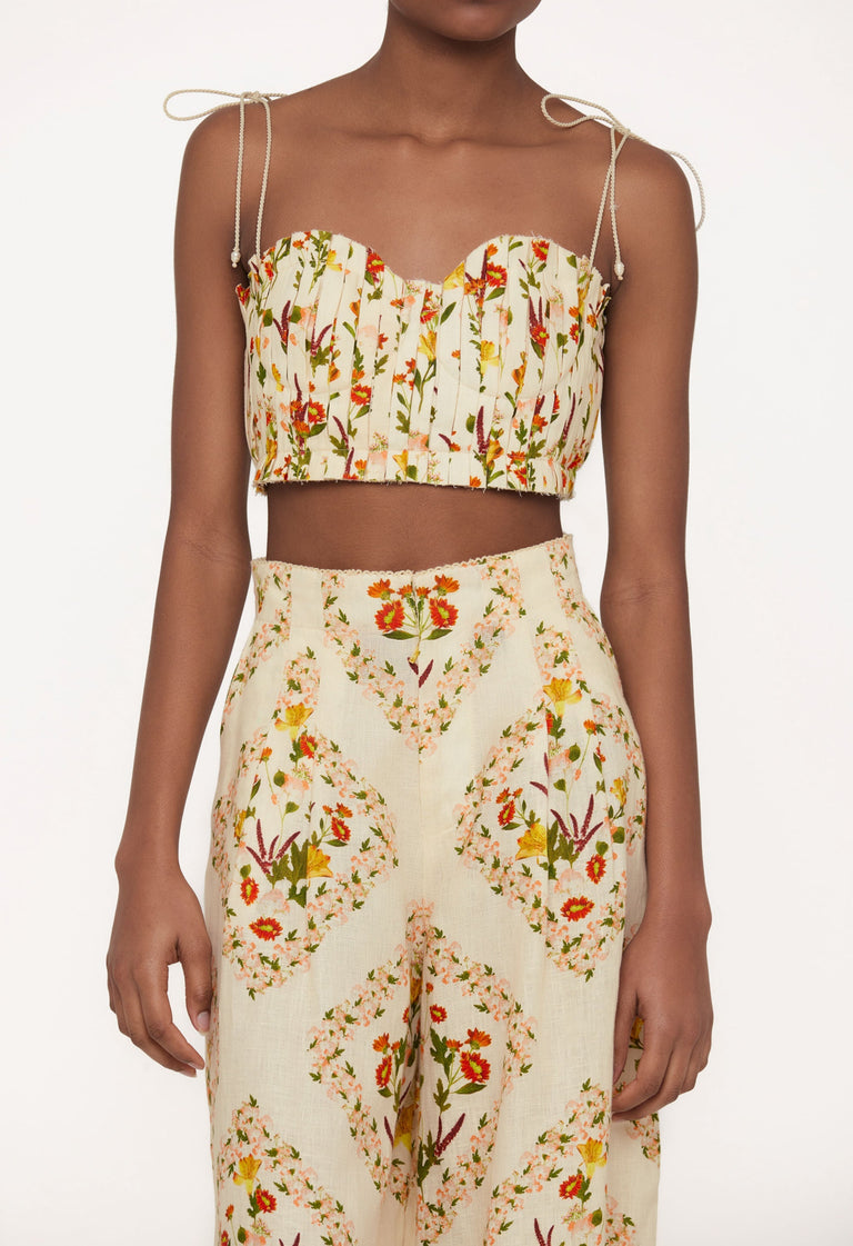 The 'Moringa Clementina' crop top is a sweet linen piece with barely-there shoulder straps, pretty pleated details, and lovely embellishments. Create a dazzling ensemble by wearing it with our 'Pinon Clementina' linen pants.