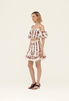 A structured linen corset featuring voluminous balloon sleeves and intricate embroidery. Our new ’Epoca Quebrada’ blends timeless romance with sculptural design, crafted to make a statement in every look from daytime garden brunces to dinners by the beach.